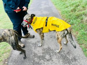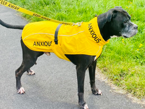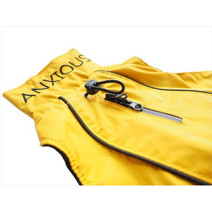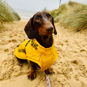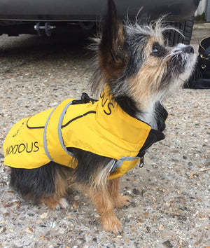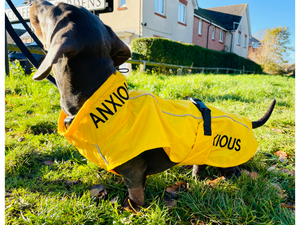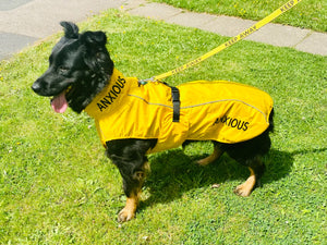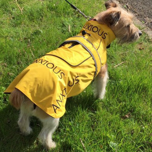 My Anxious Dog's stylish new lightweight waterproof yellow raincoat will keep your anxious dog dry and visible during wet weather adventures plus help let others know that they need space.